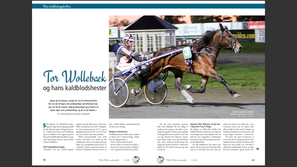 Steen Morten Eidsmo Johansen har vært på besøk hos Tor Wollebæk. Tor har kjørt mange av de riktig gode kaldblodstraverne. Gjennom denne artikkelen får vi får et rikt innblikk i Tors opplevelser med hester, eiere, trenere og andre mennesker i miljøet. Sin vane tro tar Steen Morten med leserne i humoristiske anekdoter.